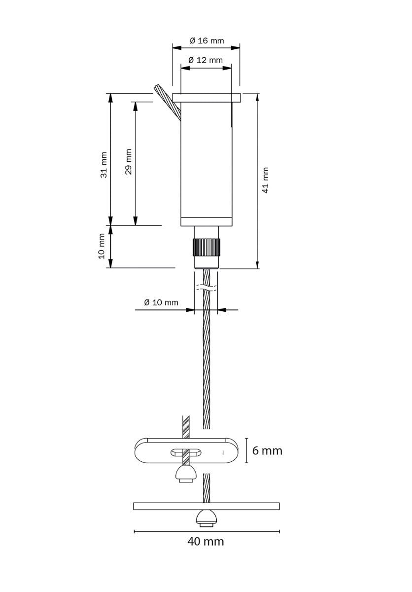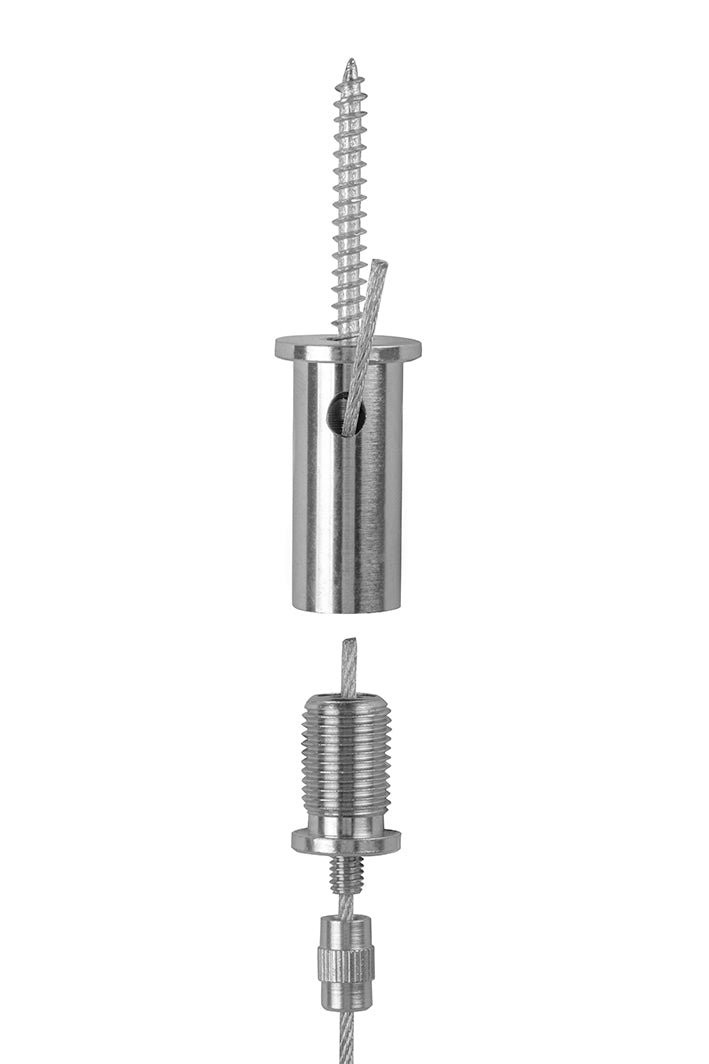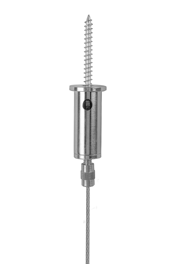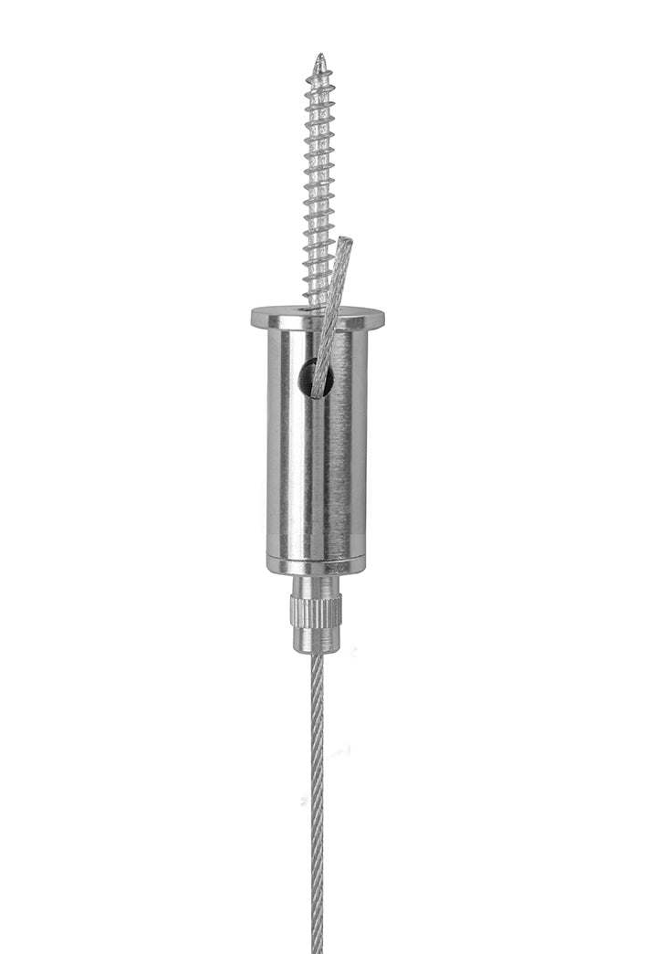 Ein 1,5 mm Stahlseil-Aufhängeset mit verstellbarer Deckenschnellbefestigung und einem einzelnen Kreuzanker am Ende zum Aufhängen von Leuchtstoffröhren oder anderen Objekten. Das Stahlseil ist von der Deckenhalterung aus höhenverstellbar und der Kreuzanker kann in die Öffnungen der meisten gängigen Leuchtstoffröhren eingehängt werden, um eine selbstsichernde Befestigung zu ermöglichen. Zum Aufhängen anderer Gegenstände müssen Löcher (ø10 mm) in das Material gebohrt werden, in das der Kreuzanker eingehängt wird.